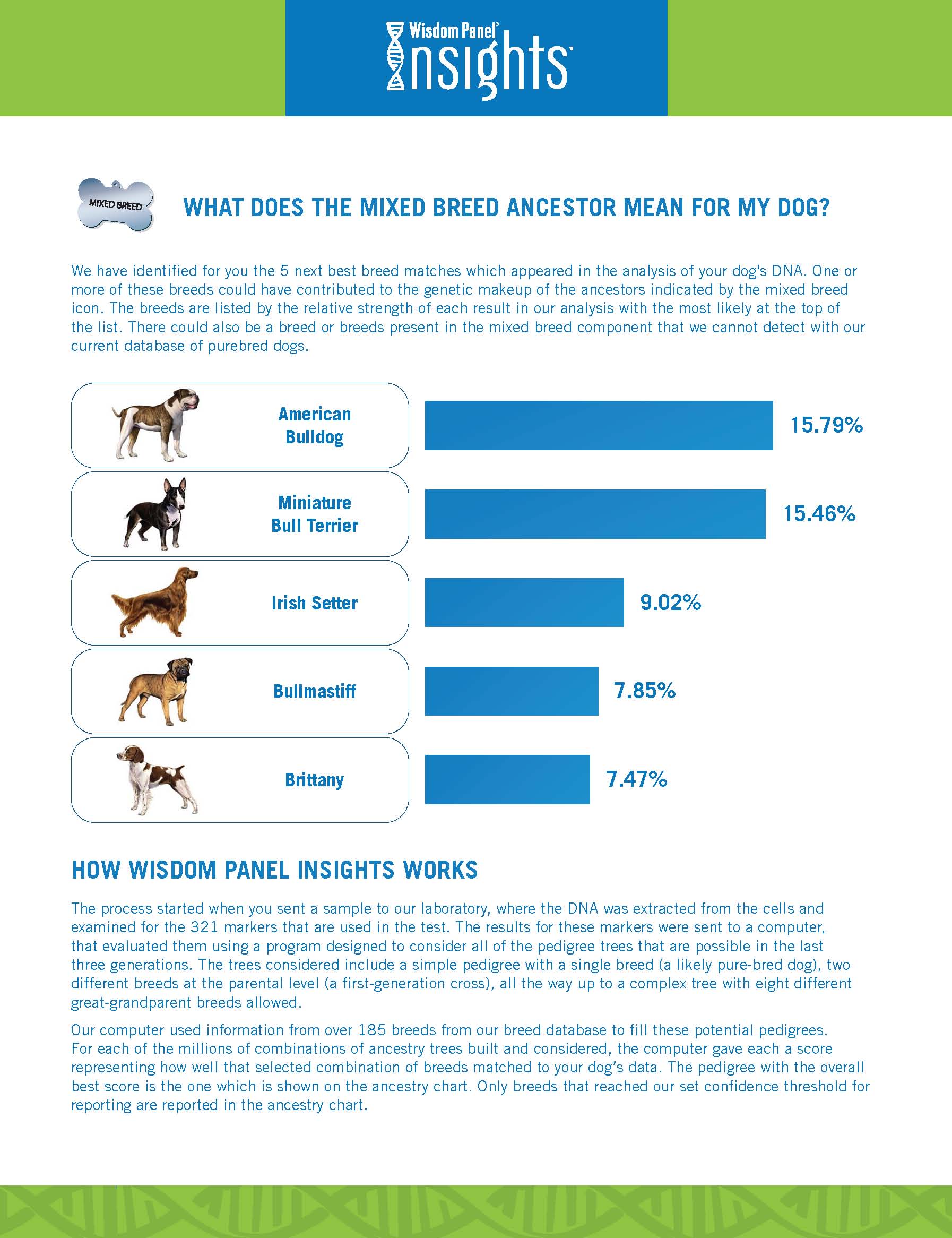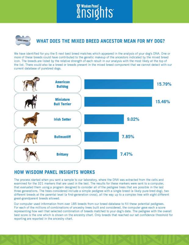 “The term “Pitbull” does not refer to a single or recognized breed of dog, but rather to a genetically diverse group of breeds. Pit bull type dogs have historically been bred by combining guarding type breeds with terriers for certain desired characteristics – and as such they may retain many genetic similarities to the likely progenitor breeds and other closely related breeds. If a pit bull type dog were tested, we might anticipate that the Wisdom Panel test might detect and report moderate to trace amounts of one or more distantly related breeds to those used to breed the dog, it is possible that one or more of the following breeds might be detected at moderate to trace amounts: the American Staffordshire terrier, Boston terrier, Bull terrier, Staffordshire Bull terrier, Mastiff, Bullmastiff Boxer, Bulldog and various small terriers like the Parson Russell. These breeds would be detected because some markers in these breeds have genetic identity at a minority of the markers the Wisdom Panel test uses to the breeds in our database.