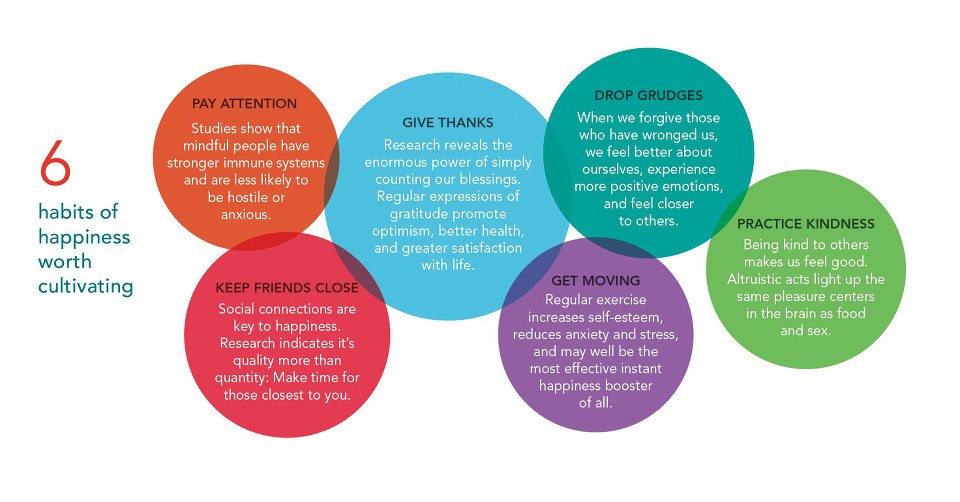 Engaging in regular self-care builds resiliency, which can help us bounce back from the stress of our jobs. The self-care tips above also cultivate happiness. Yay! Graphic from The Greater Good.